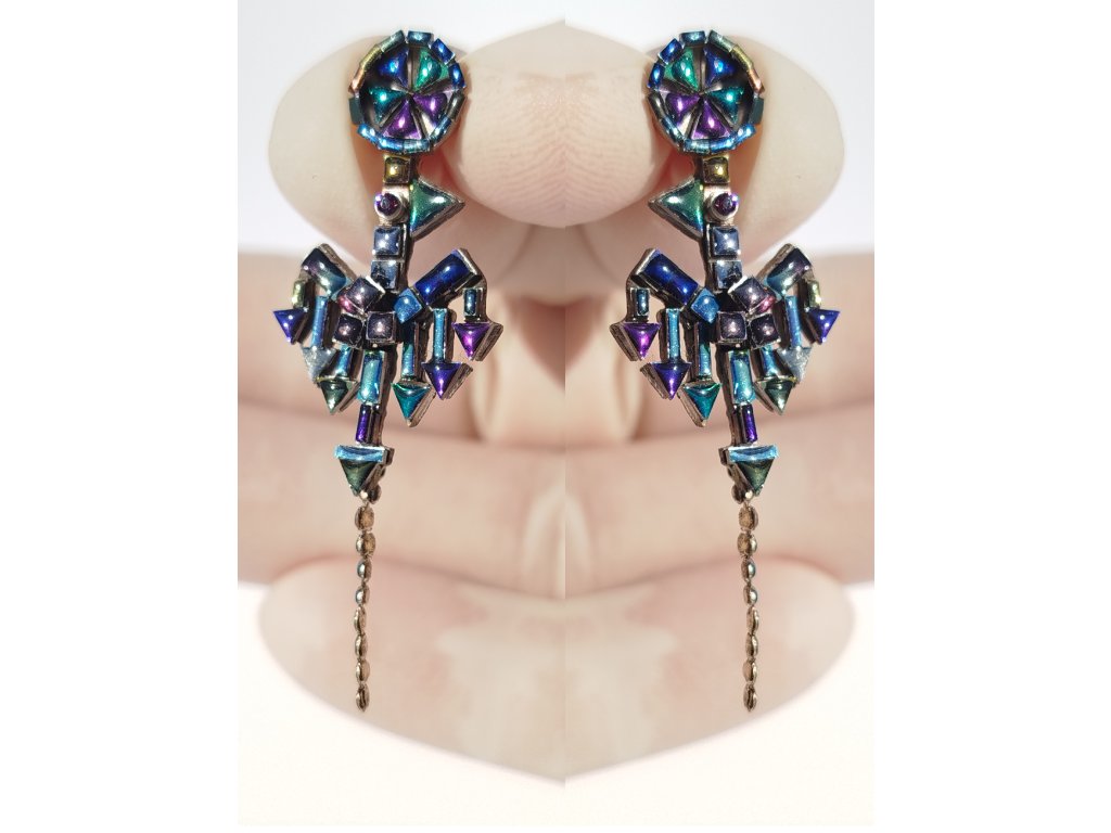 - Základ tvoria malé strieborné mikro-dlaždice (2–3 mm), rezané a spájkované do rôznych tvarov – trojuholníkov, štvorcov, obdĺžnikov.