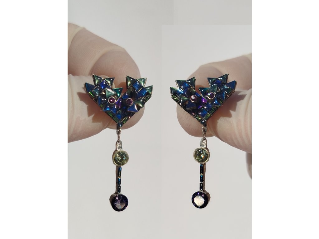 - Základ tvoria malé strieborné mikro-dlaždice (2–3 mm), rezané a spájkované do rôznych tvarov – trojuholníkov, štvorcov, obdĺžnikov.