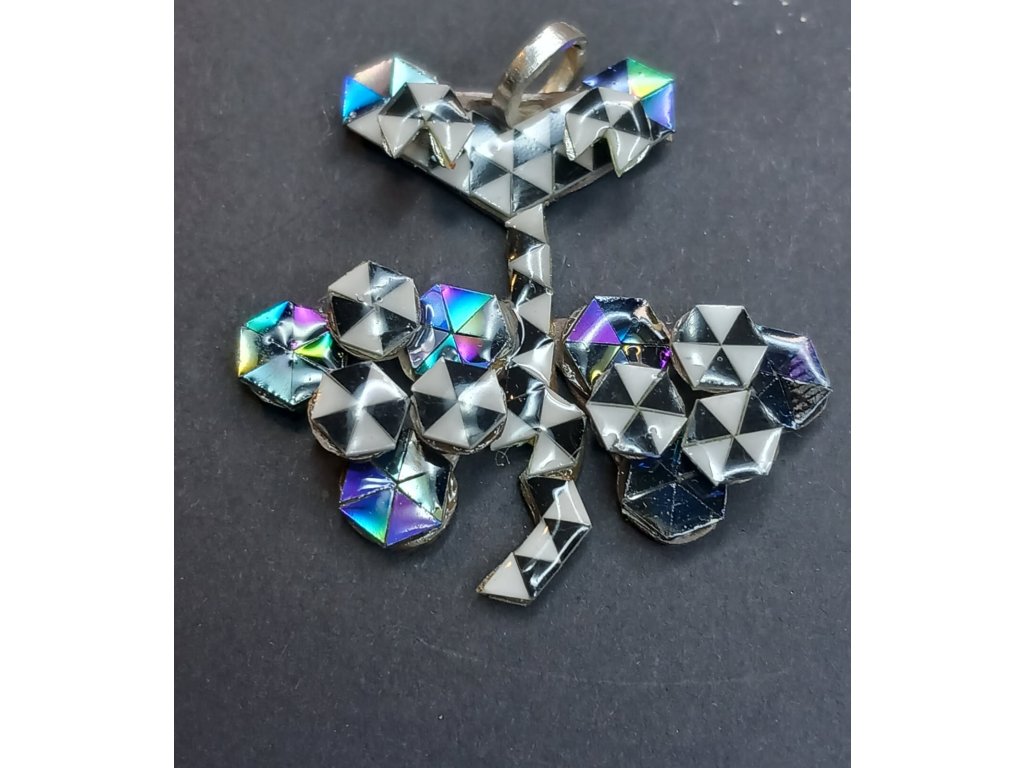 - Základ tvoria malé strieborné mikro-dlaždice (2–3 mm), rezané a spájkované do rôznych tvarov – trojuholníkov, štvorcov, obdĺžnikov.